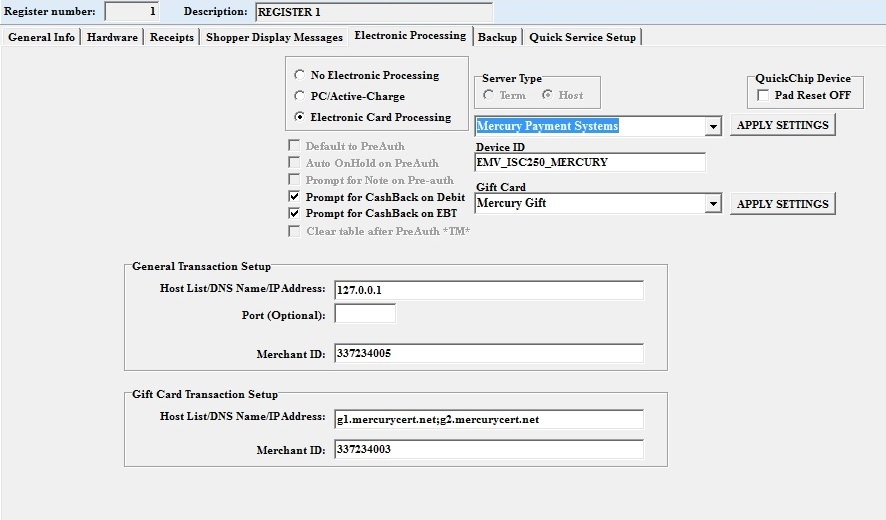 Select a Gift Card Processor (if any) and Apply Settings.