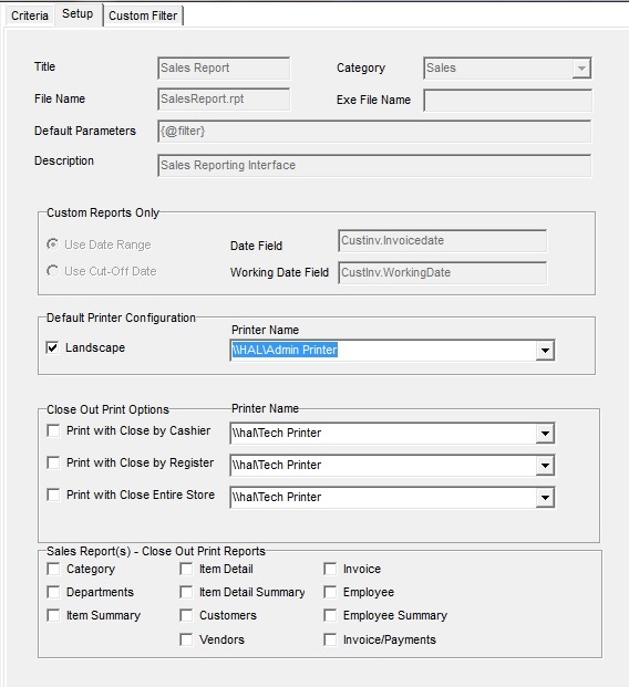 Many reports have the option to automatically print of close out of cashier, register or store